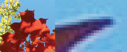 دومین نقطه ضعف مدل رستری این است که تصاویر خروجی نسبت به همتایان برداری خود «زیبایی» کمتری دارند. این موضوع بهویژه زمانی مشهود است که تصاویر رستری بزرگ یا مقیاسدار میشوند (به شکل ۴٫۱ “تصویر دیجیتال با زوم نشاندهنده پیکسل شدن تصویر رستری” مراجعه کنید). بسته به میزان بزرگنمایی، جزئیات و انسجام تصویر شطرنجی به سرعت در میان انبوهی از پیکسلها به نظر میرسد که از سلولهای شبکهای بهطور تصادفی رنگآمیزی شدهاند.