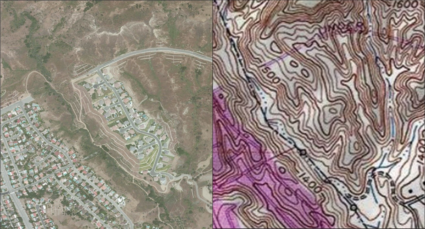شکل ۴٫۳ گرافیک رستری رایج مورد استفاده در برنامه های GIS: عکس هوایی (سمت چپ) و USGS DEM (راست)