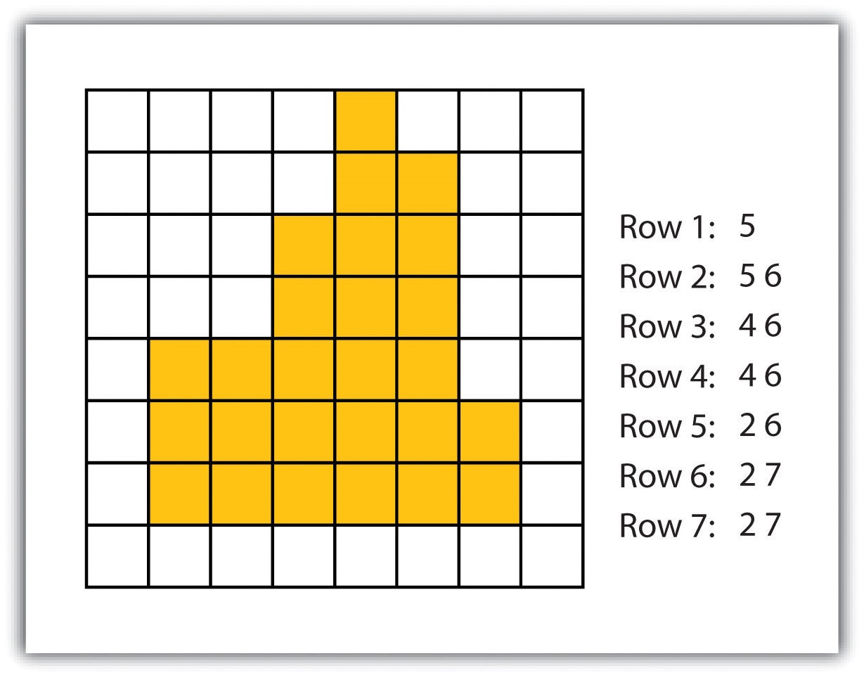 - رمزگذاری رستری سلول به سلول، روشی فشرده است که با ایجاد رکورد برای هر مقدار سلول بر اساس ردیف و ستون، یک رستر را رمزگذاری میکند (شکل ۴٫۵ “کدگذاری سلول به سلول دادههای رستر”). این روش میتواند بهعنوان یک صفحه گسترده بزرگ تصور شود که در آن هر سلول از صفحه گسترده نمایانگر یک پیکسل در تصویر رستری است. به این روش همچنین “شمارش جامع” گفته میشود.