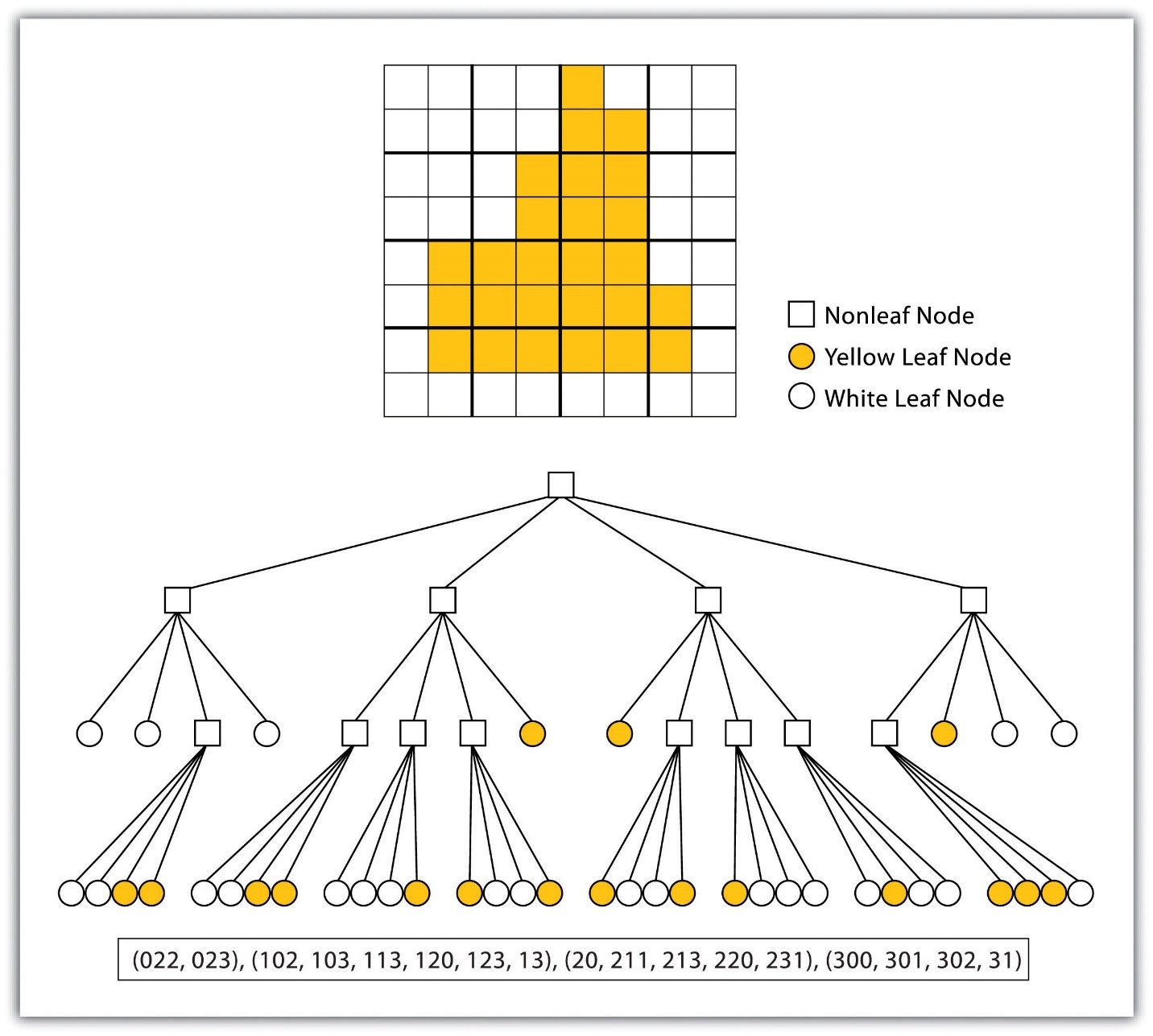 - کدگذاری رستری چهار درختی، یک رستر را به سلسلهمراتبی از ربعها تقسیم میکند که بر اساس پیکسلهای همارزش مشابه تقسیمبندی میشوند (شکل ۴٫۷ “کدگذاری چهار درختی دادههای رستری”). فرآیند تقسیم رستری زمانی متوقف میشود که یک ربع به طور کامل از سلولهایی با همان مقدار تشکیل شود. ربعی که دیگر قابل تقسیم نباشد، “گره برگ” نامیده میشود.
