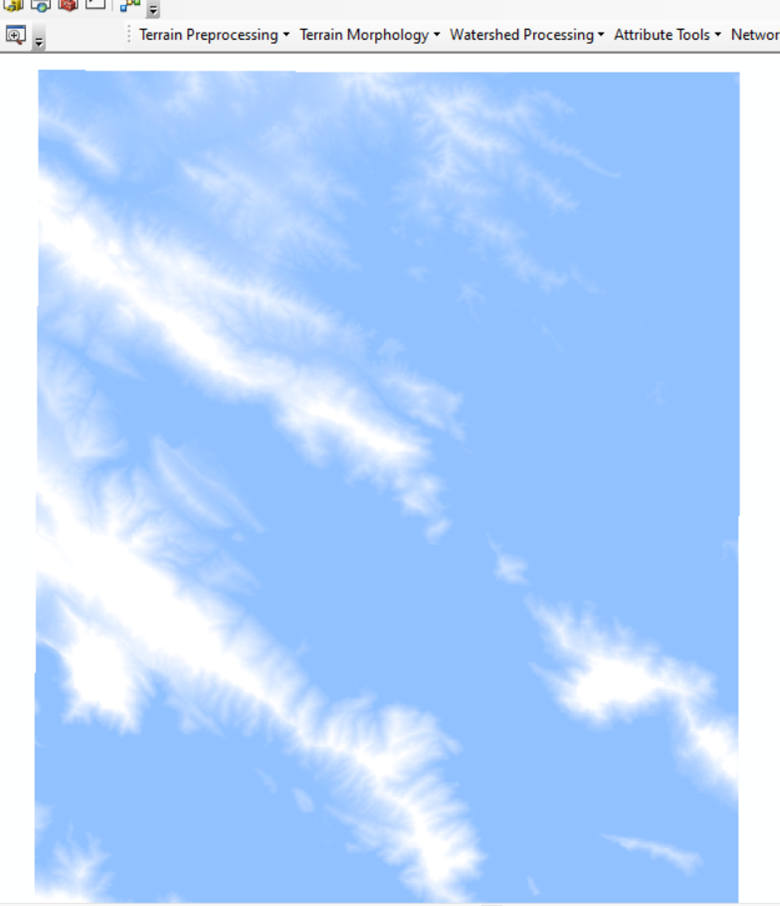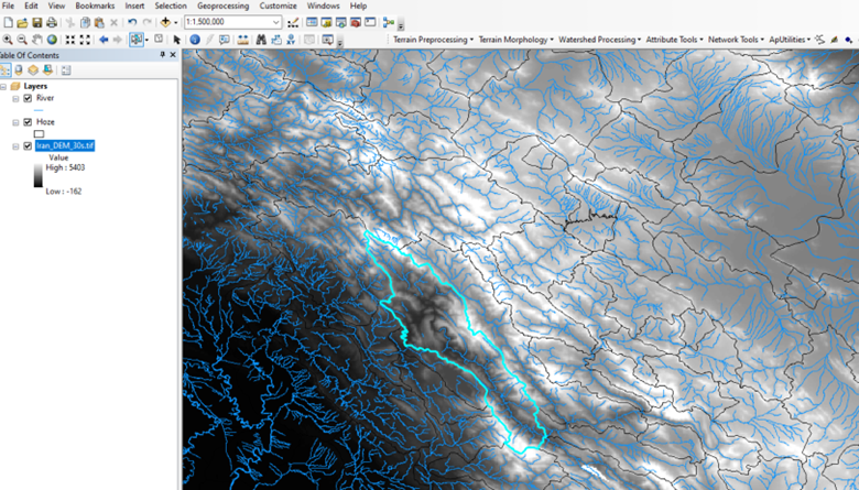 چنانکه مشاهده می کنید لایه ارتفاعی به صورت رستری مشاهده می شود.سپس لایه های بعدی که شامل حوزه و رودخانه می باشد انتخاب می کنیم.
