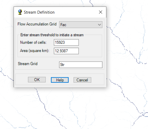 یک آبراهه ، در رایجترین تعریف خود، جریان پیوسته آب در یک کانال است که معمولاً کوچکتر از یک رودخانه است. همچنین میتواند به جریان ثابت هر سیال یا توالی پیوسته هر چیزی، مانند جریان رودخانه یا حوضه آبریز، اشاره داشته باشد.تابع تعریف جریان یک شبکه تجمع جریان (برچسب “شبکه تجمع جریان”) را به عنوان ورودی دریافت میکند و یک شبکه جریان (برچسب “شبکه جریان”) برای یک آستانه تعریف شده توسط کاربر ایجاد میکند. این آستانه یا به صورت تعدادی سلول (پیشفرض ۱٪) یا به صورت یک منطقه زهکشی بر حسب کیلومتر مربع تعریف میشود.