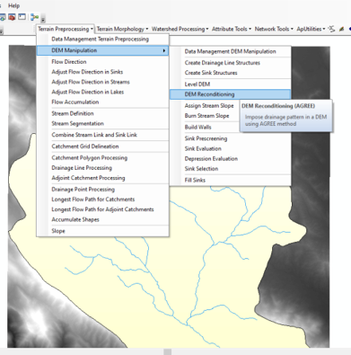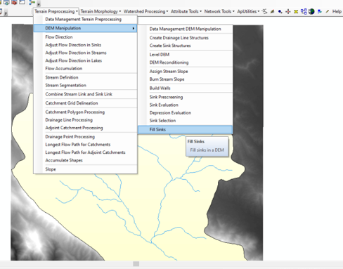 در صورتیکه که از حوضه خود و رودخانه محدوده مورد نظرمان اطمینان کامل داریم و احتمال خطا وجود نداشته باشد برای شرطی سازی dem مورد نظرمان بر روی رودخانه ها از منوی مذکور اقدام به ادامه روند ومراحل که در تصویر ذیل مشاهده می کنید انجام می دهیم.